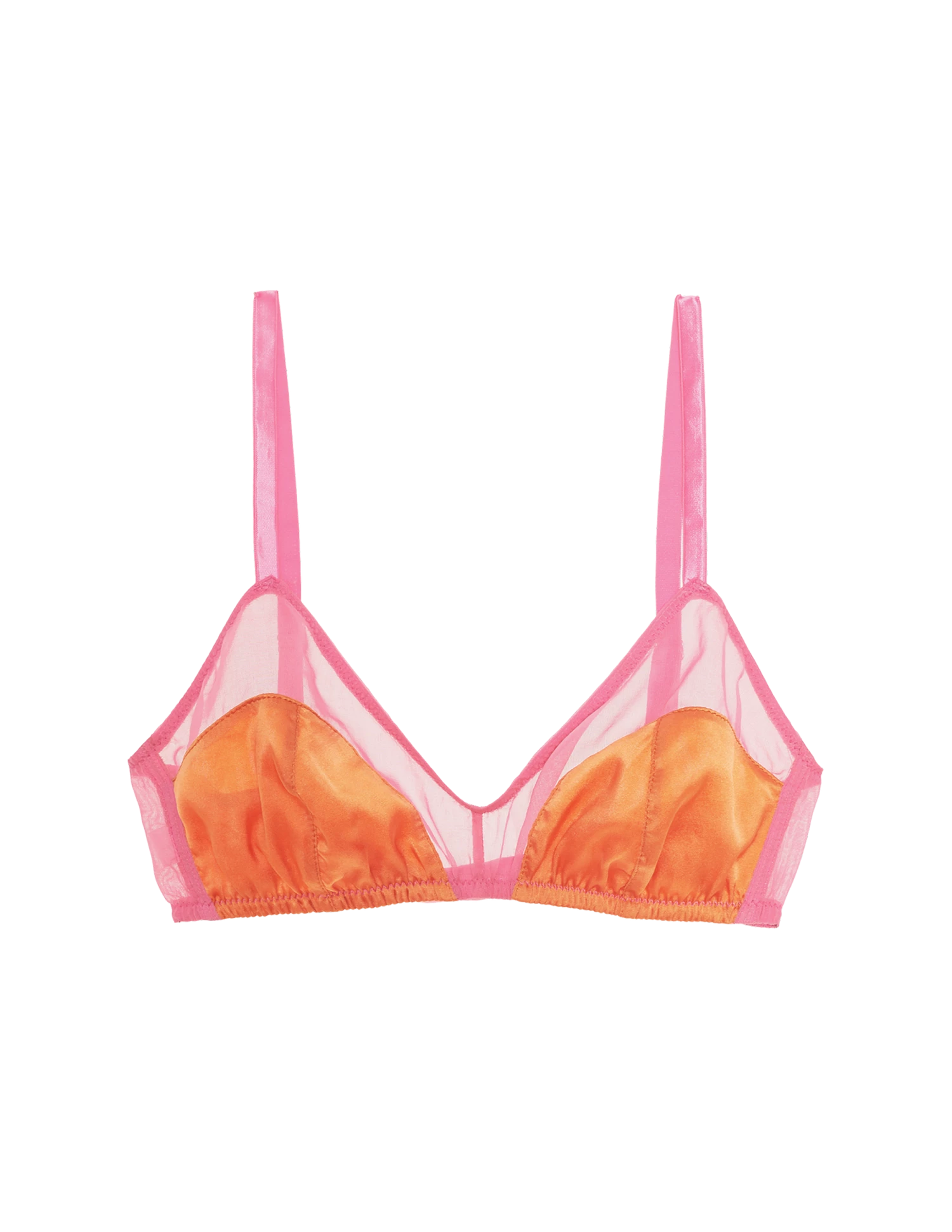 Silk chiffon bralette with silk charmeuse soft-cup detail. Adjustable straps. Hook & eye back closure. Make it a pair with the matching Aaron Panty. See additional colorways.