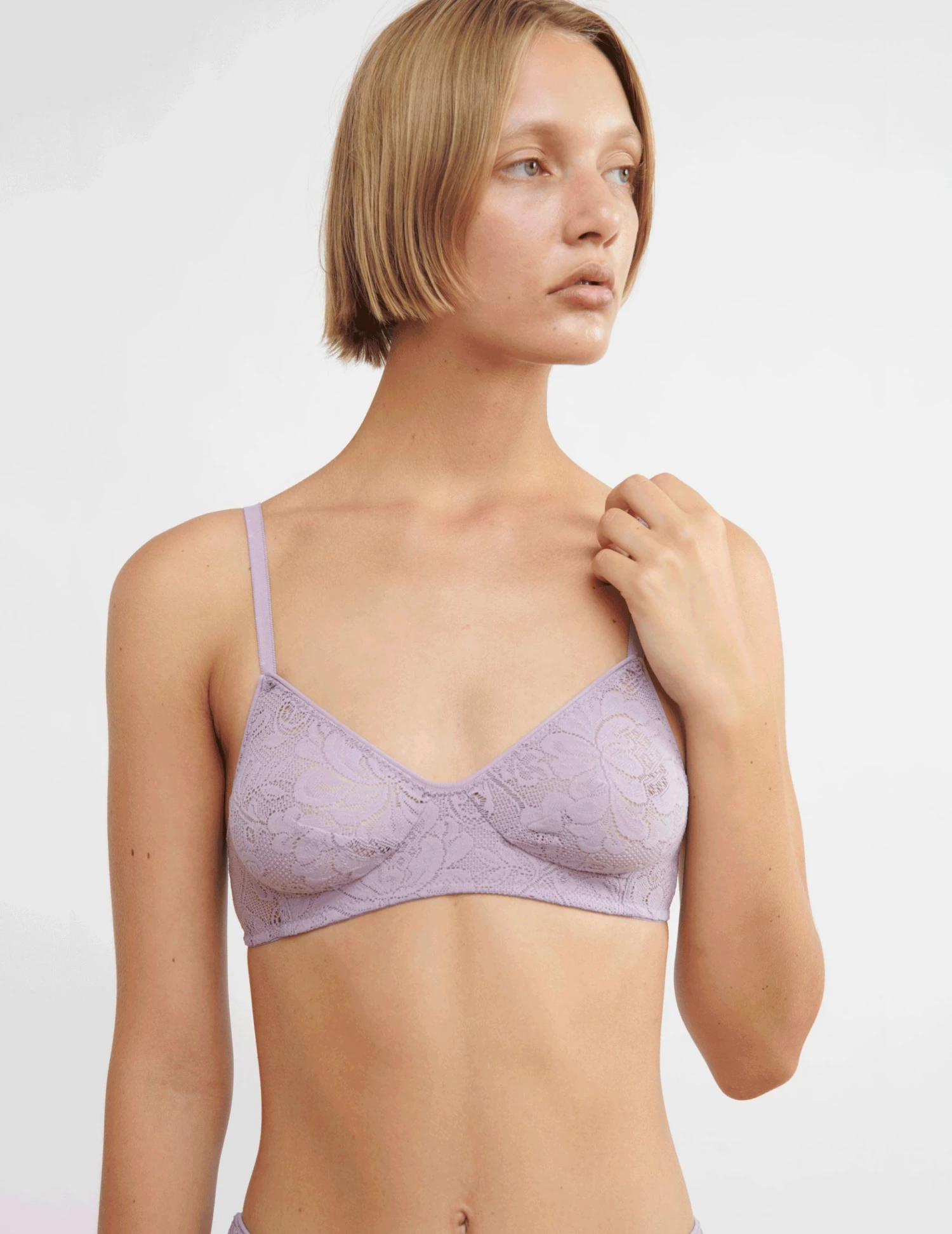 A classic soft cup bra cut in soft French stretch lace for a chic and modern look.  Designed with a frame under the bust for added support, this bra is offered for D-cup sizes as well.  Pairs nicely with the Tris Panty or the Tali Hipster. See additional colorways. Â