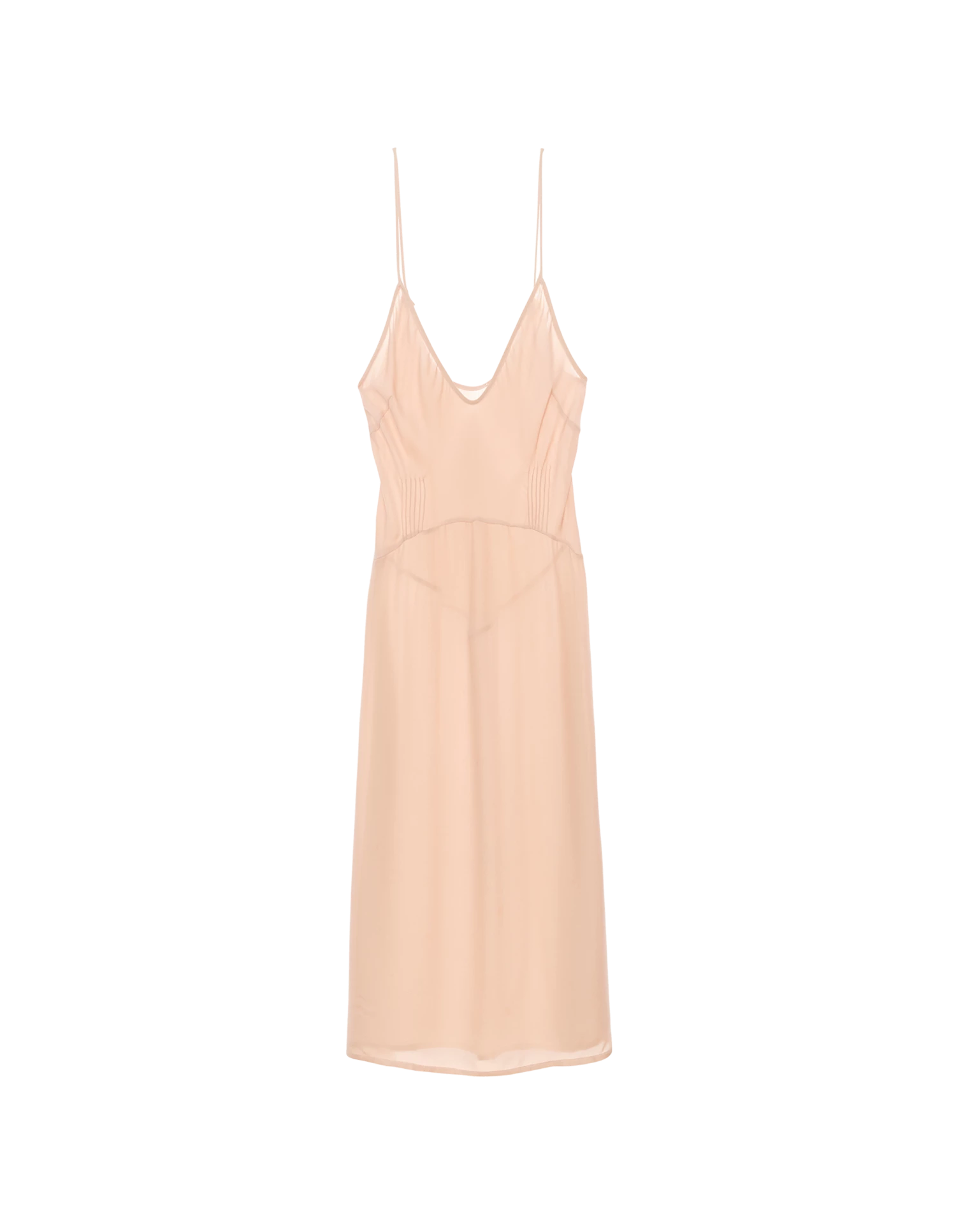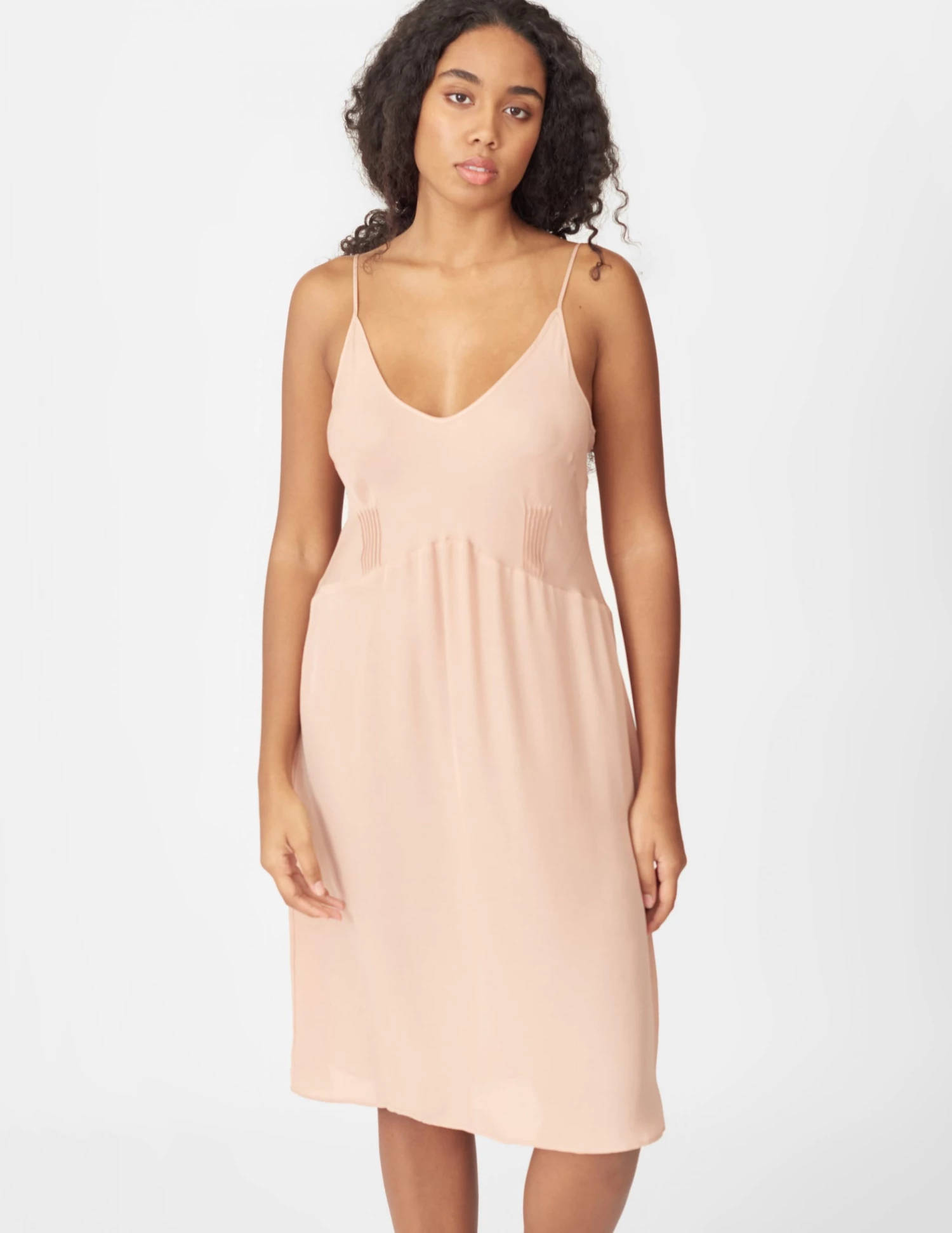 Fitted washed silk georgette slip with fine pintucking detail for added shape through the waist. Falls right at the knee. See other available colorways here.