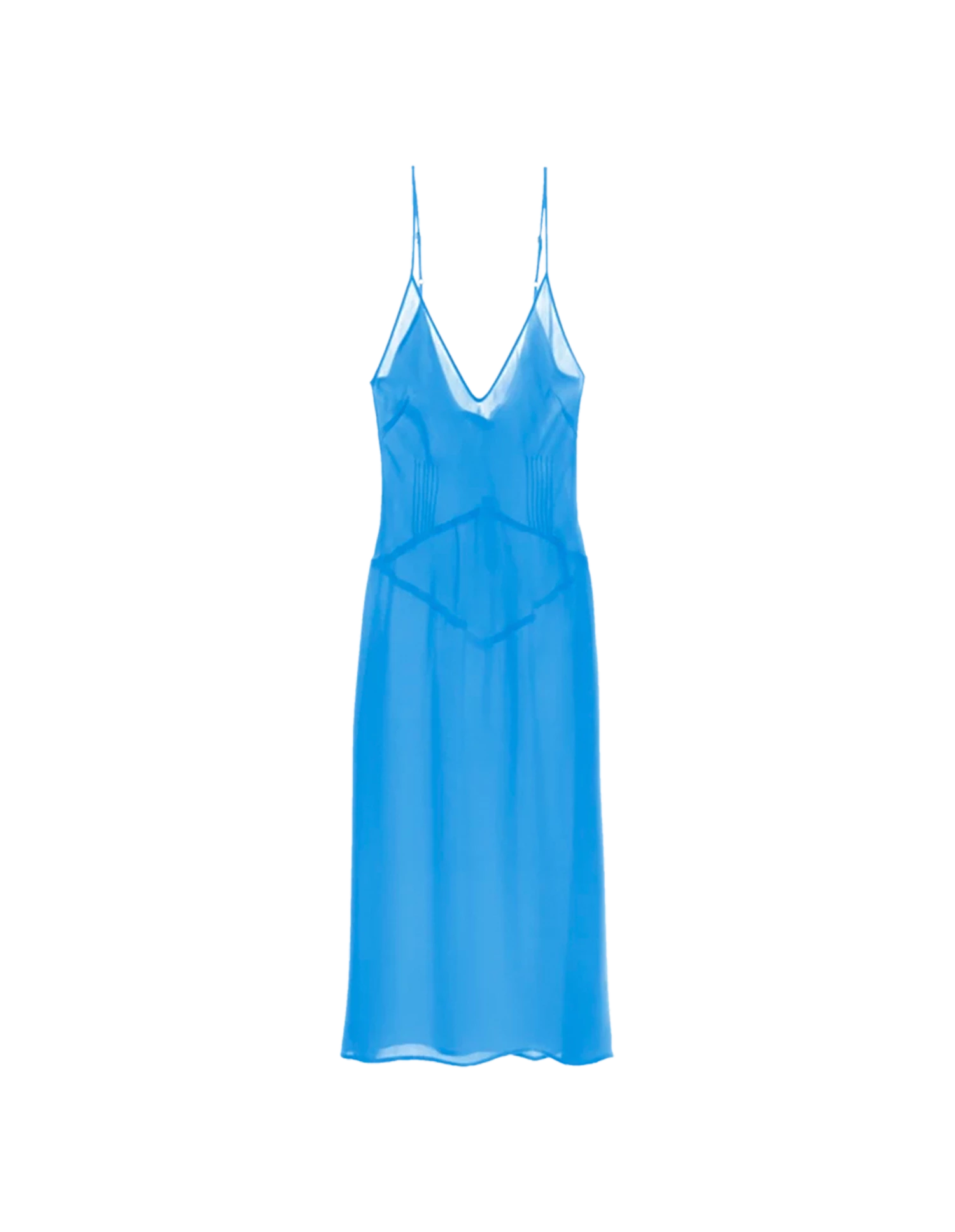 Fitted washed silk georgette slip with fine pintucking detail for added shape through the waist. Falls right at the knee. See other available colorways here.Â