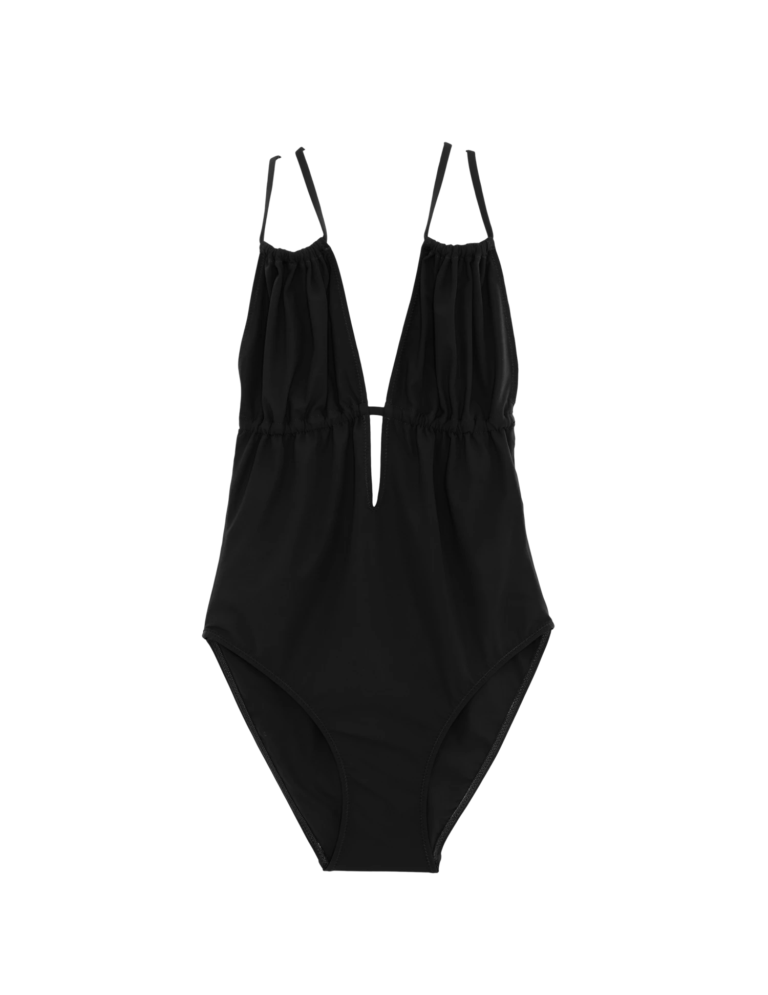 A chic one piece swimsuit featuring soft gathers and light support under the bust.  A keyhole cutout in front and a strappy low cut back show just enough skin. See additional colorways.