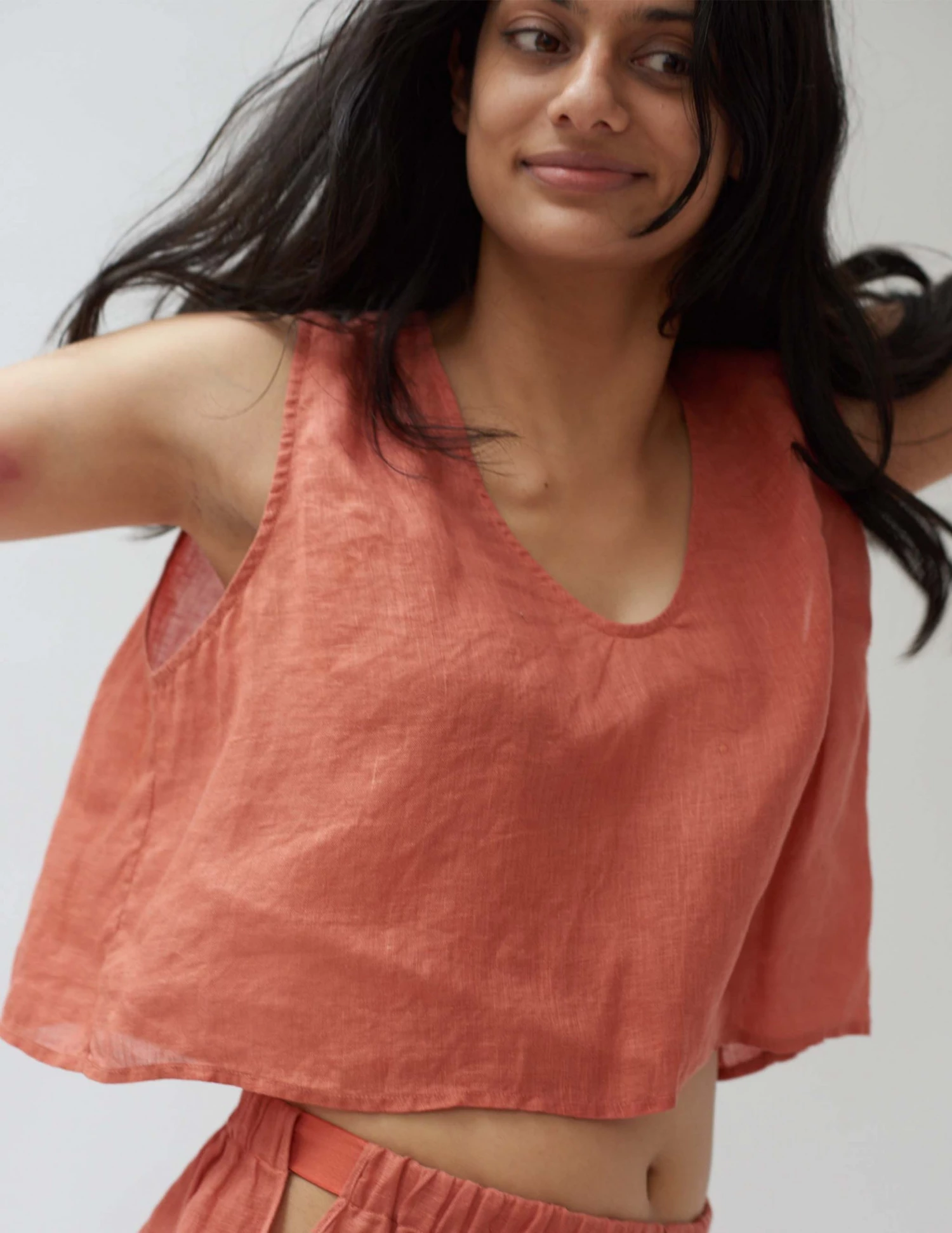 A roomy, airy tank cut from lightweight Italian organic linen gets its color from madder root, a plant dye. Make it a set with the Eduardo Boxer or Ella Pant.Â