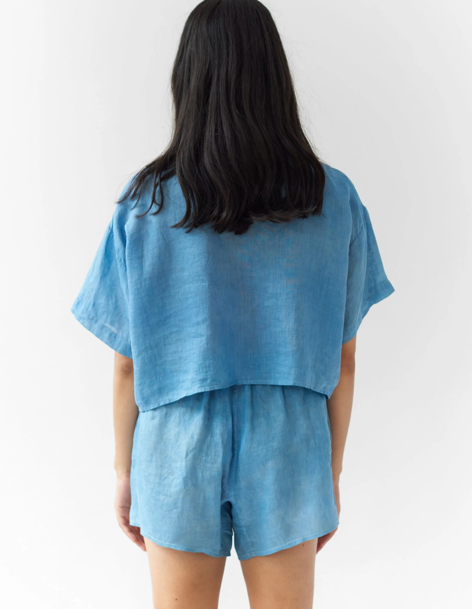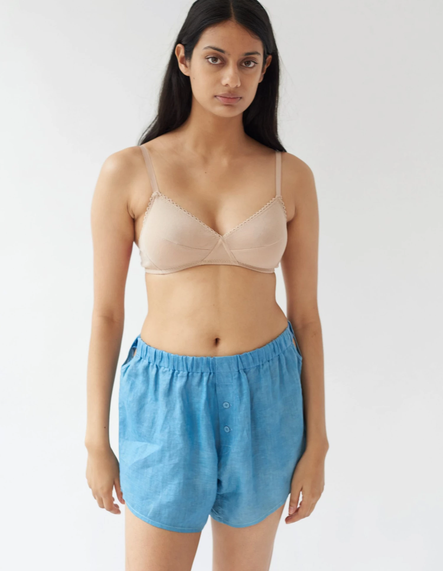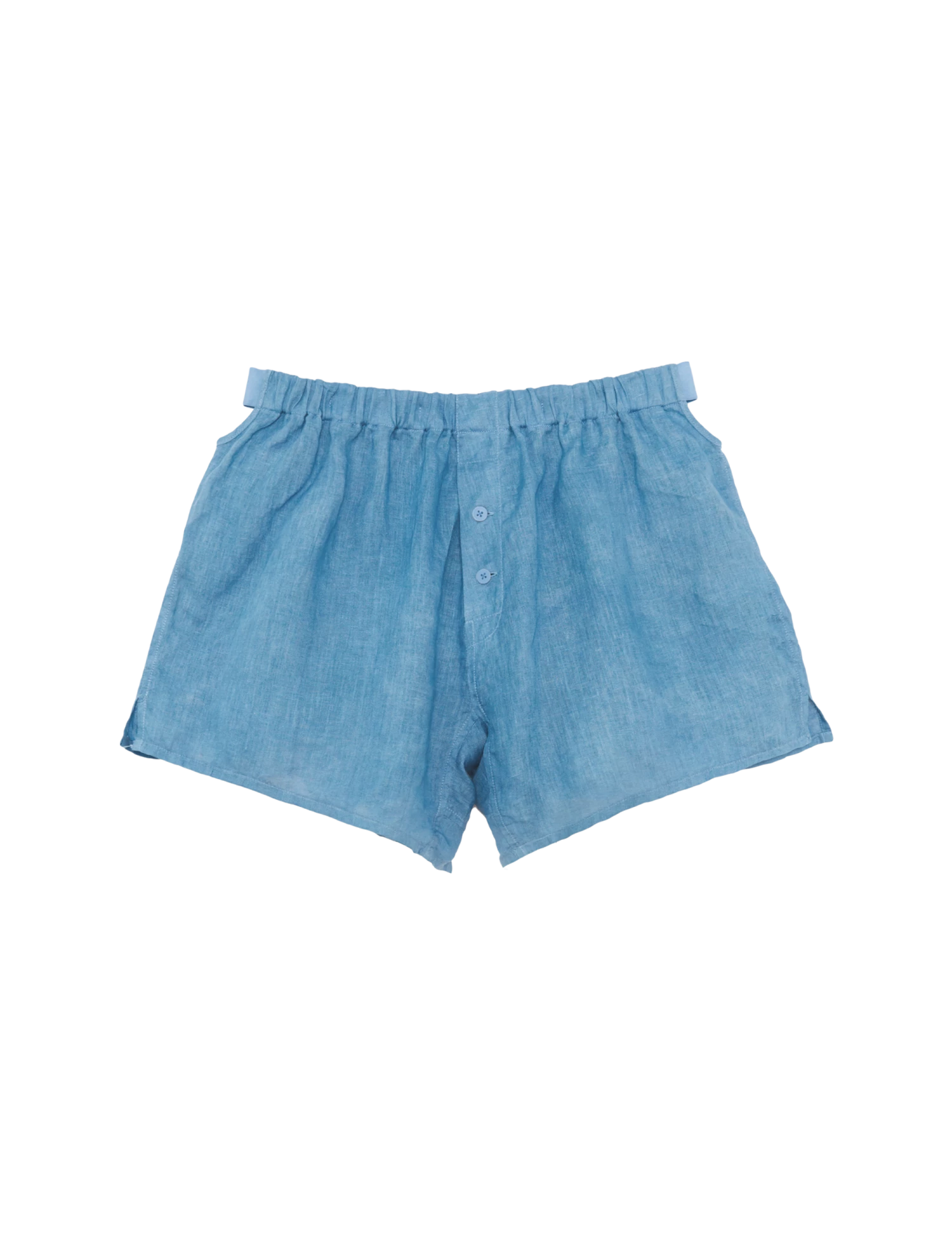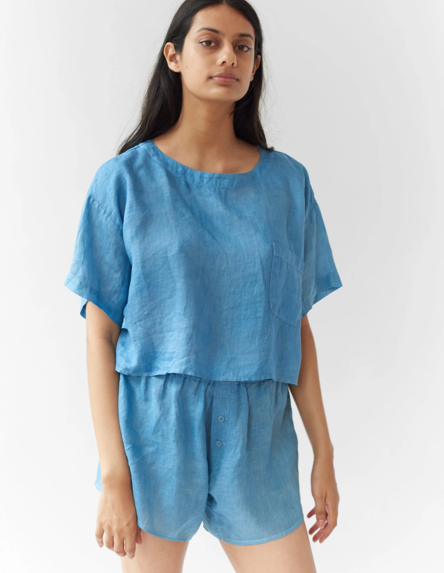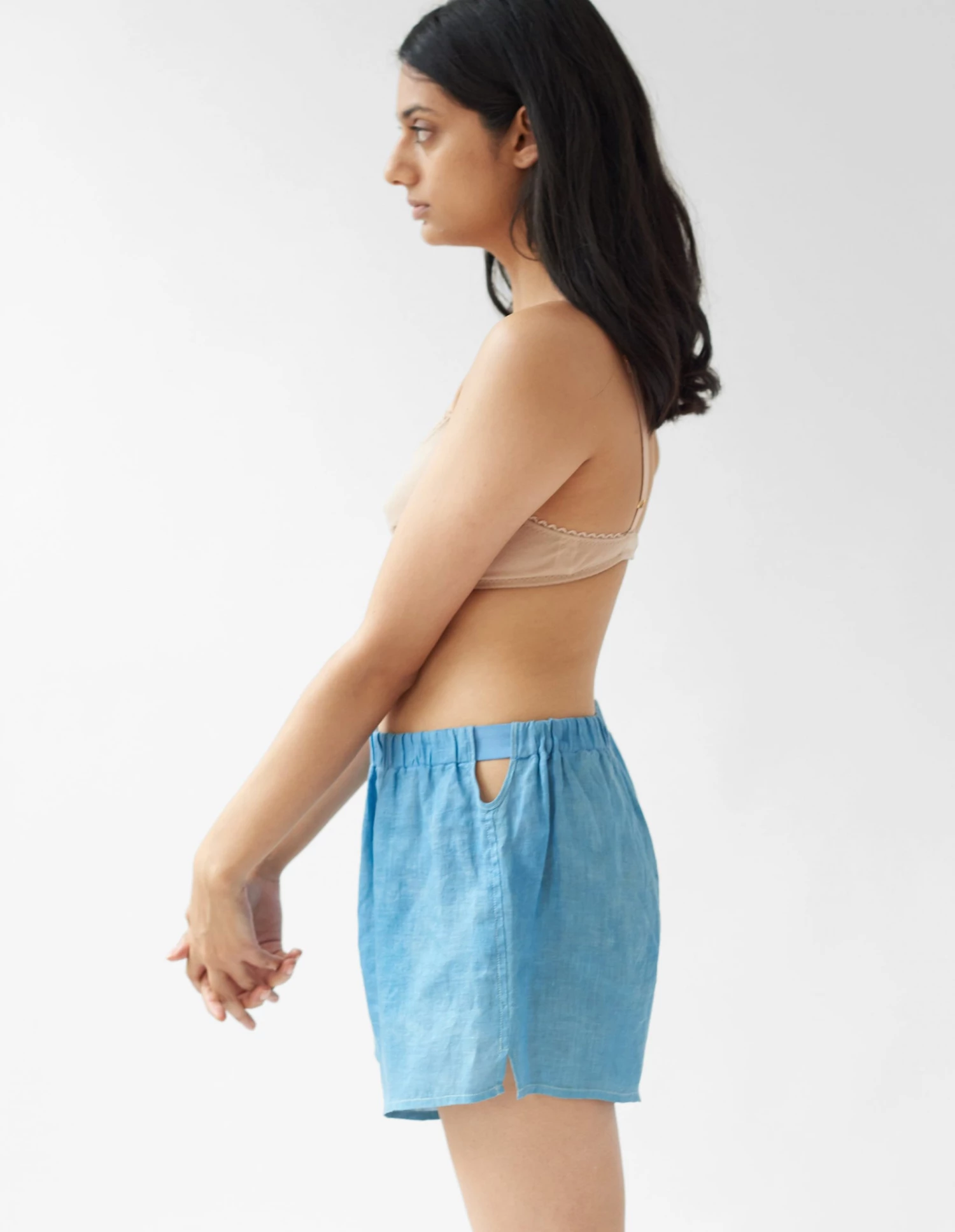 Cut in lightweight organic Italian linen and dyed with indigo, a plant dye, we’ve updated this sartorial sleep favorite with quiet cutouts at the hips for a more modern feminine feel. The soft elasticized waistband allows you to wear them on your hips or higher up depending on your mood. Casual and quietly chic, enjoy wearing these shorts to bed as well as styling them with other favorites in your wardrobe for an array of looks. Pairs nicely with the Elliot Tee. See other available colorways here.