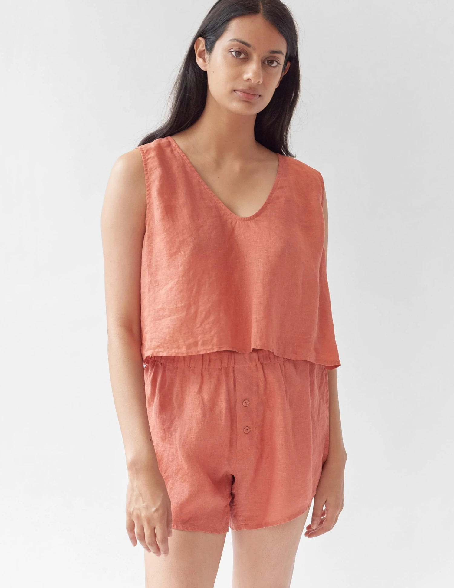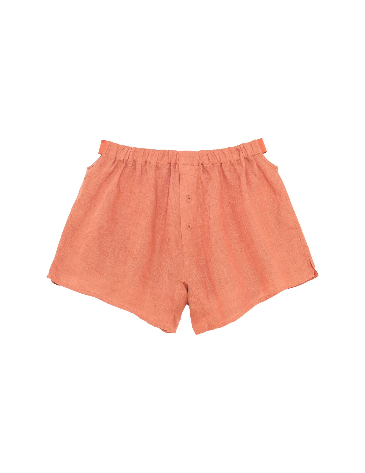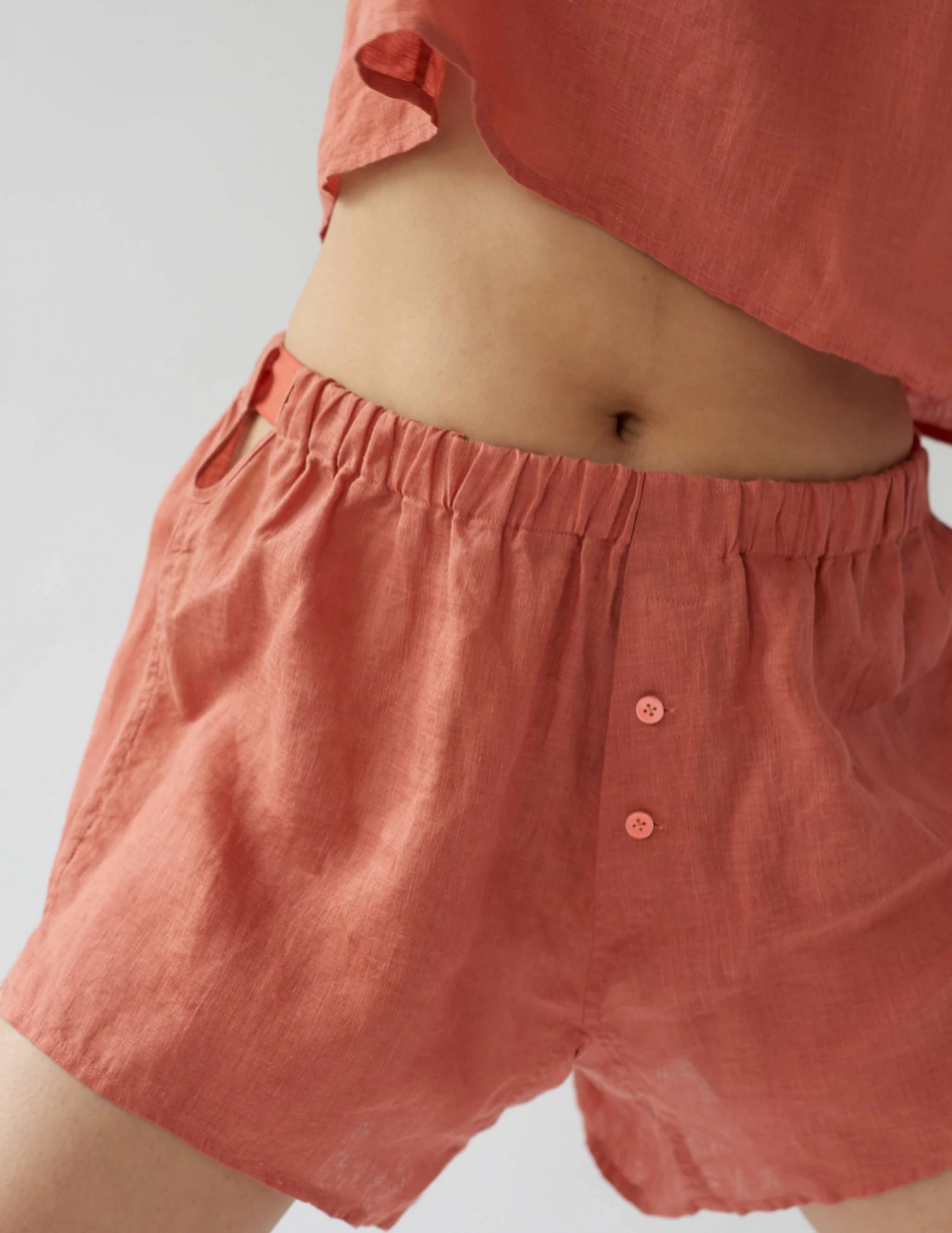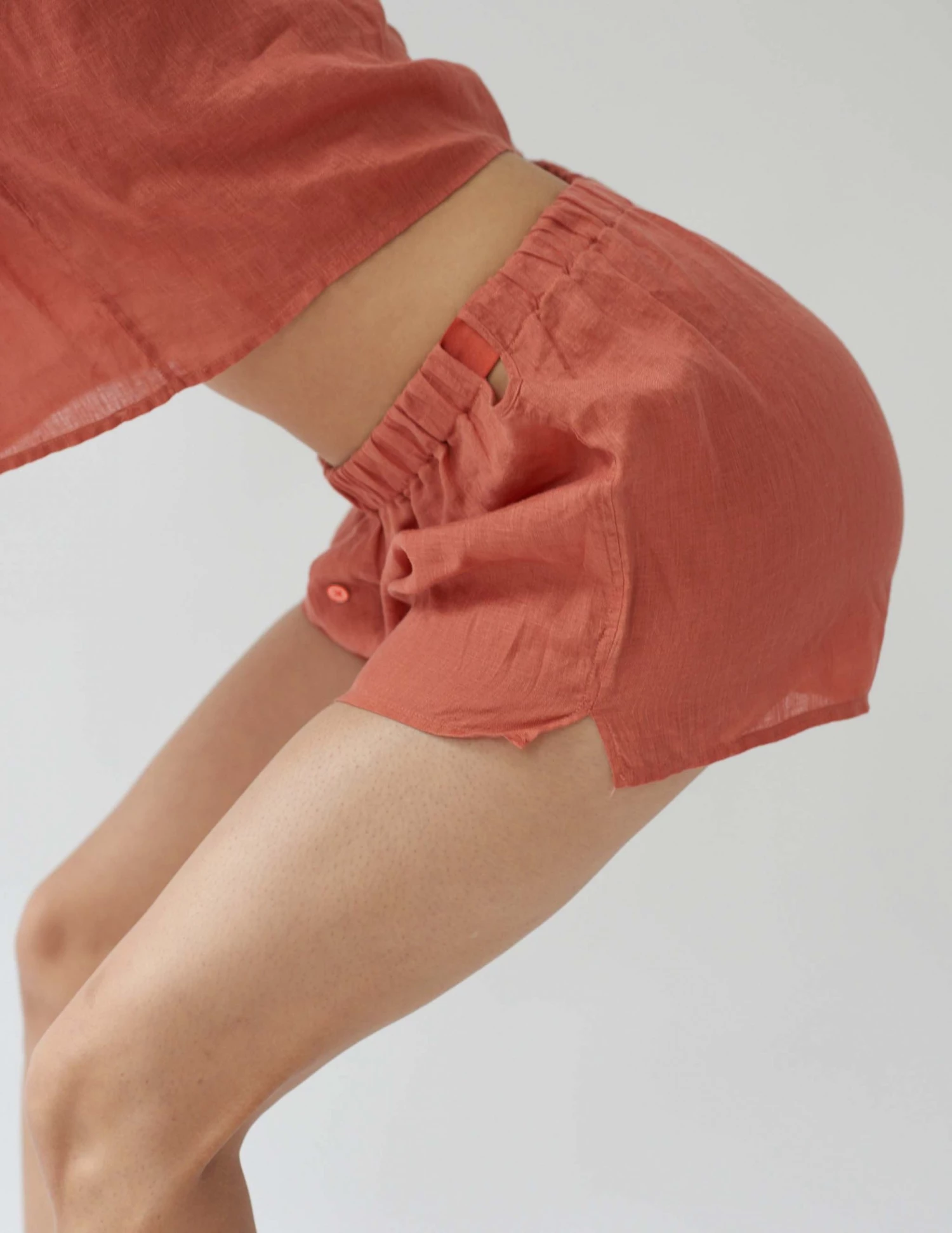 Cut in lightweight organic Italian linen and dyed with madder root, a plant dye, we’ve updated this sartorial sleep favorite with quiet cutouts at the hips for a more modern feminine feel. The soft elasticized waistband allows you to wear them on your hips or higher up depending on your mood. Casual and quietly chic, you’ll enjoy sleeping in these shorts as well as styling them with other favorites in your wardrobe for an array of looks. Pairs nicely with the Edie Tank. See other available colorways here.