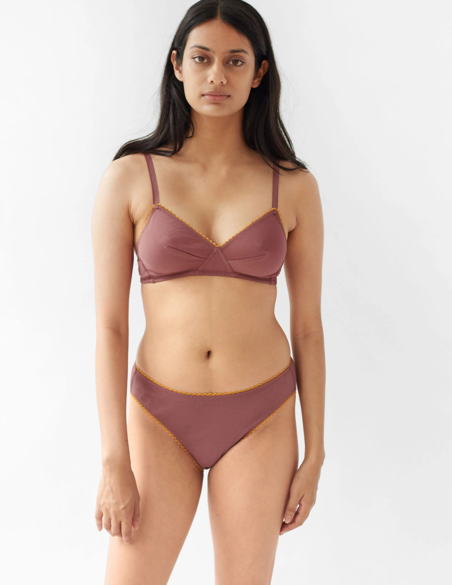 Cut from GOTS certified organic cotton rib fabric, the Antonia bralette made its debut in 2000, and to this day is sewn by the same hands in the same local factory. Organic cotton rib fabric is accompanied by playful crochet trim detailing for a bralette that is sustainable, feminine and comfortable. Wear it with the matching Isabella Panty or Mabel Hipster. See additional colorways.