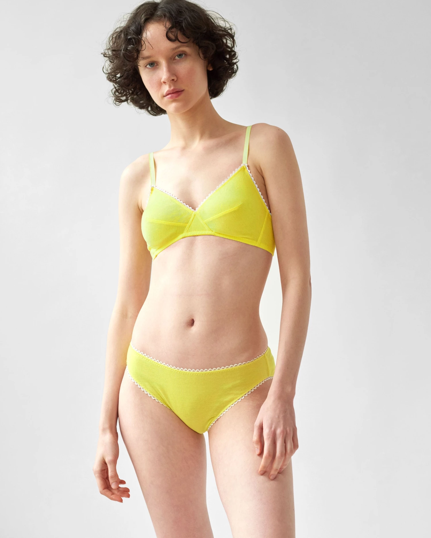 Cut from GOTS certified organic cotton rib fabric, the Antonia bralette made its debut in 2000, and to this day is sewn by the same hands in the same local factory. Organic cotton rib fabric is accompanied by playful crochet trim detailing for a bralette that is sustainable, feminine and comfortable. Wear it with the matching Isabella Panty or Mabel Hipster. See additional colorways.