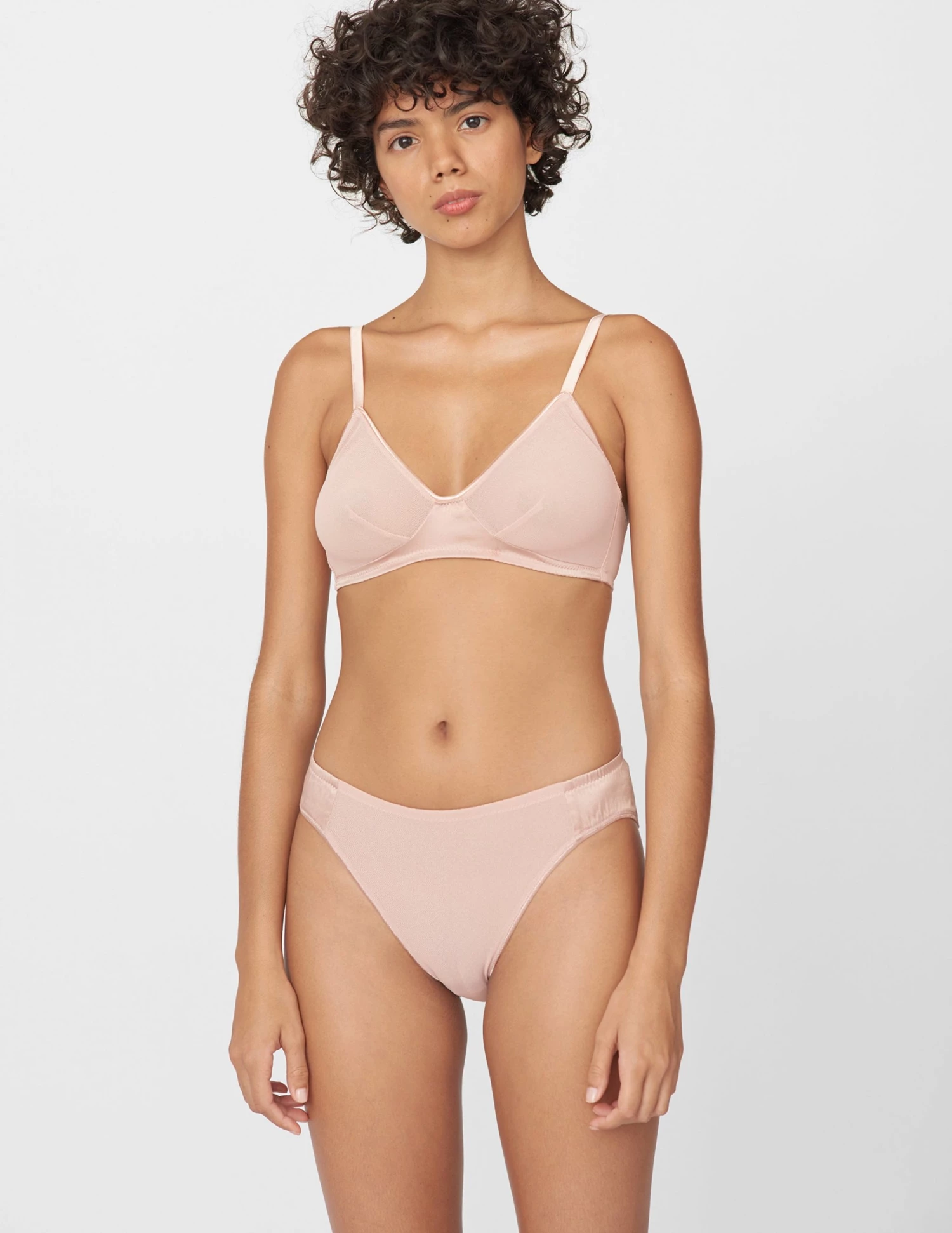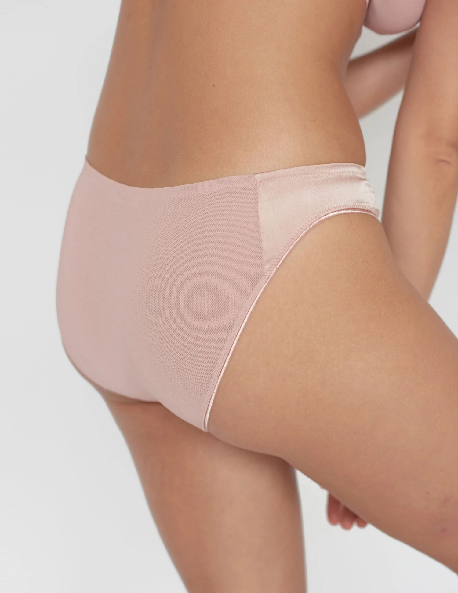 Feminine and modern, a comfortable mid-rise mesh panty accented with tonal silk stretch charmeuse panels at the sides. Strategically placed, the seams of the side panels naturally draw the eye inward creating a lengthening and slimming effect. Pair with the Tasia Bralette or Winona Bra. See additional colorways.