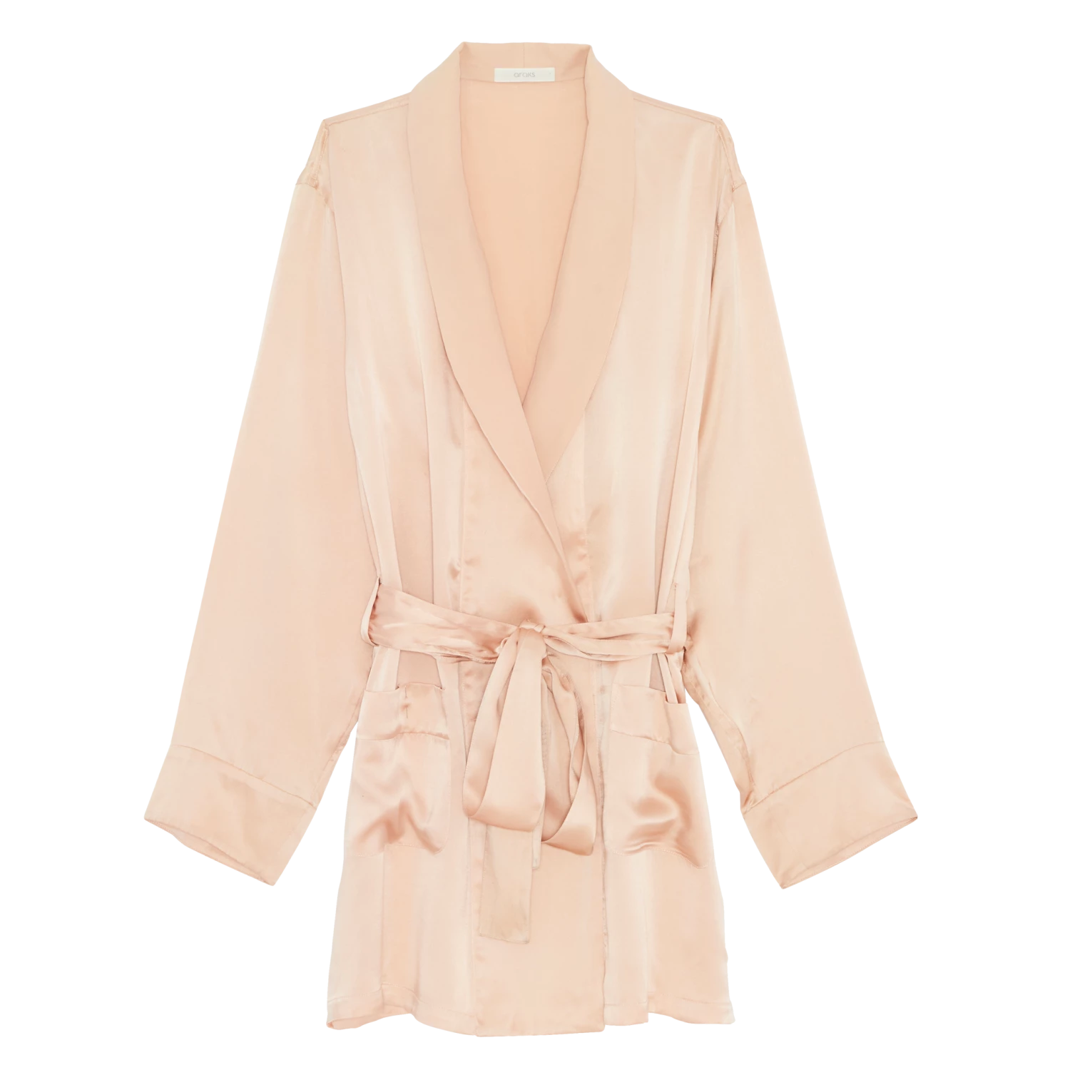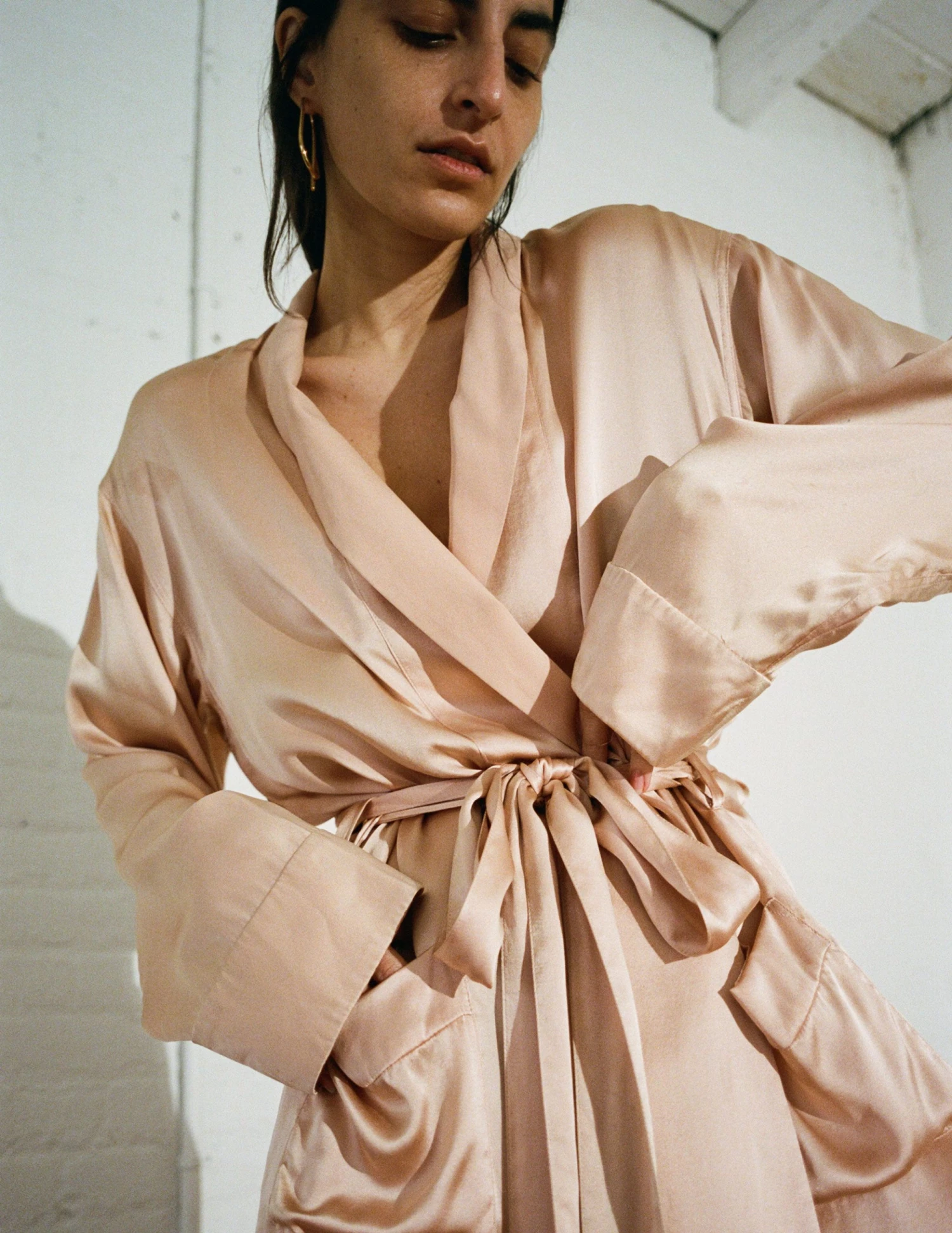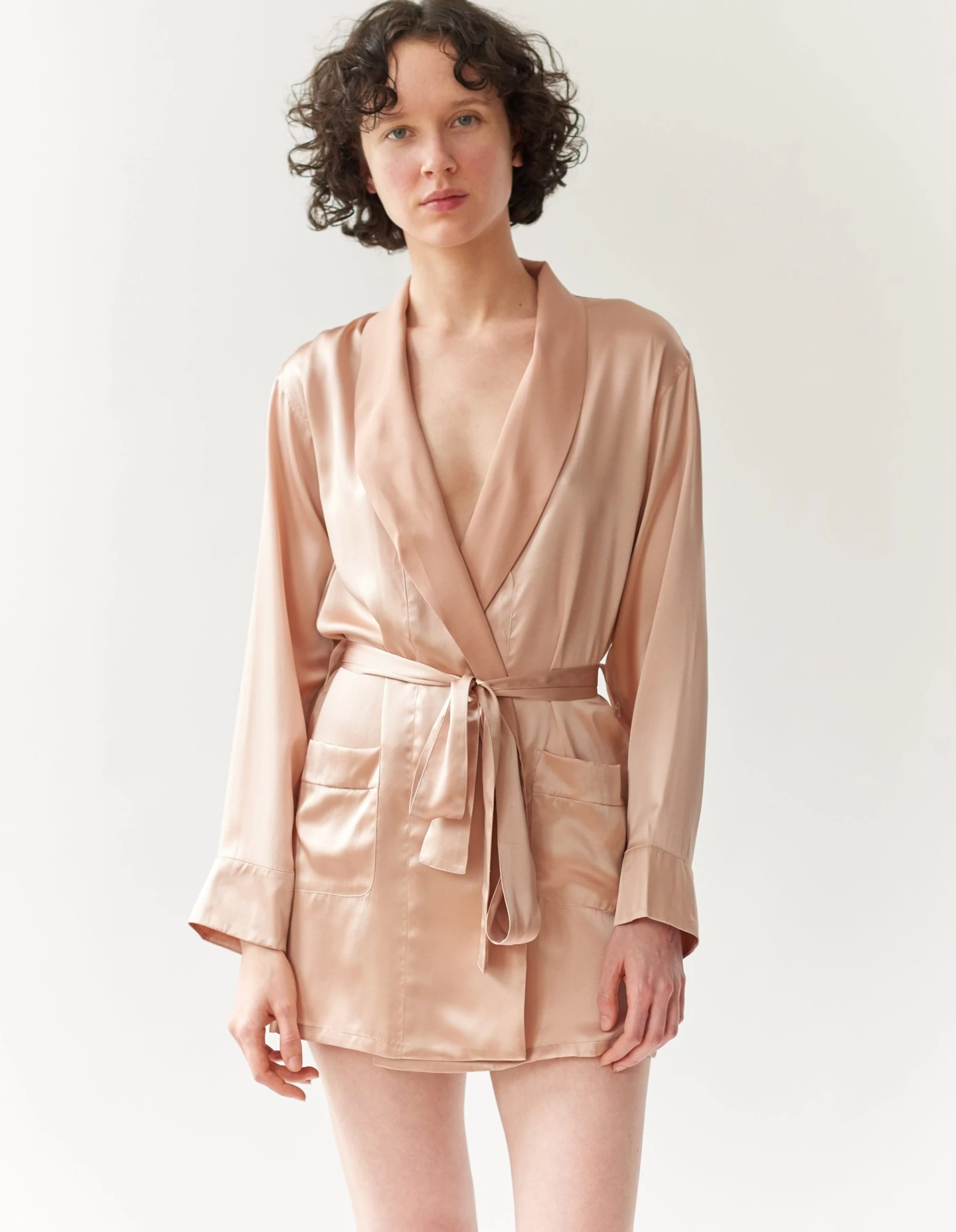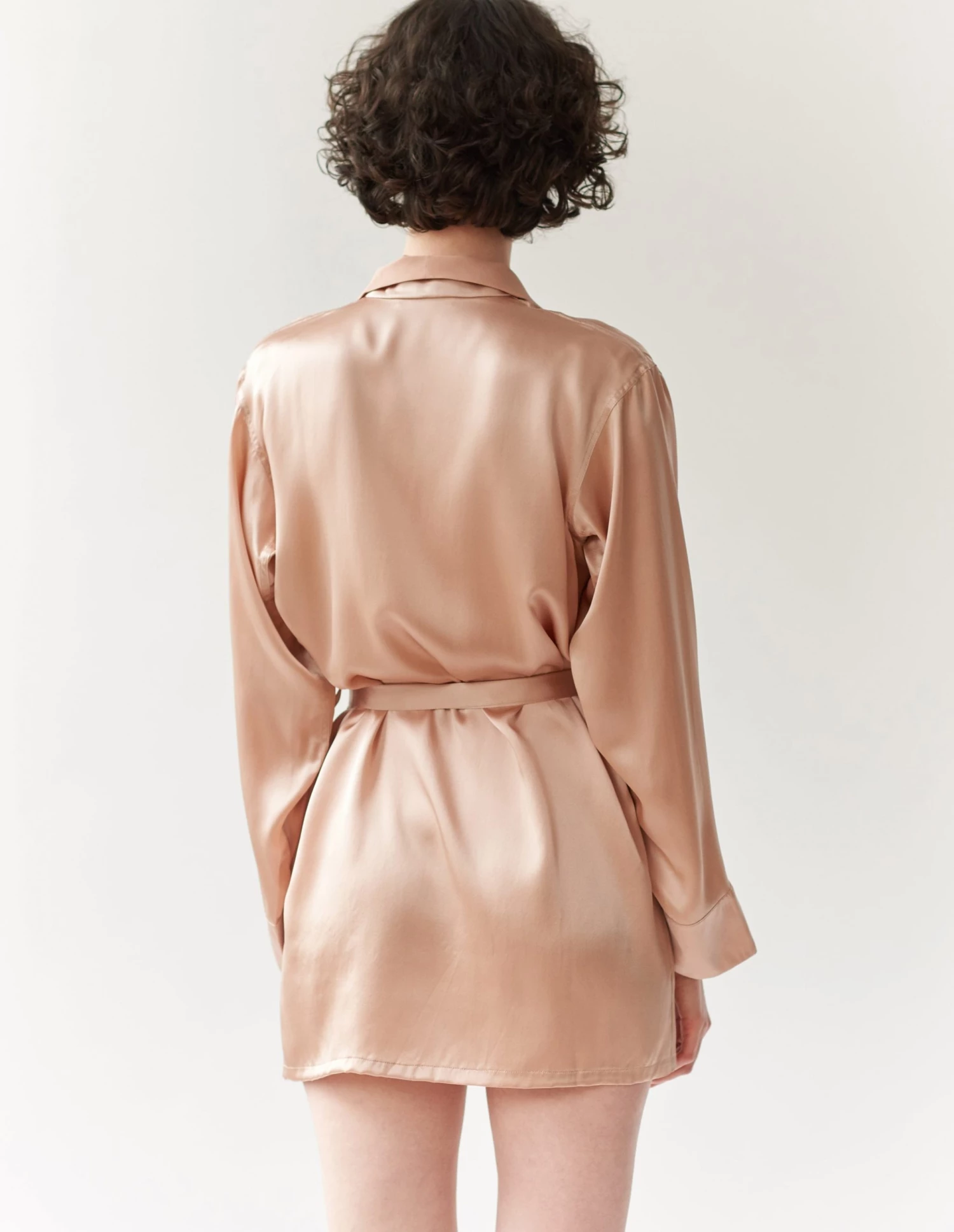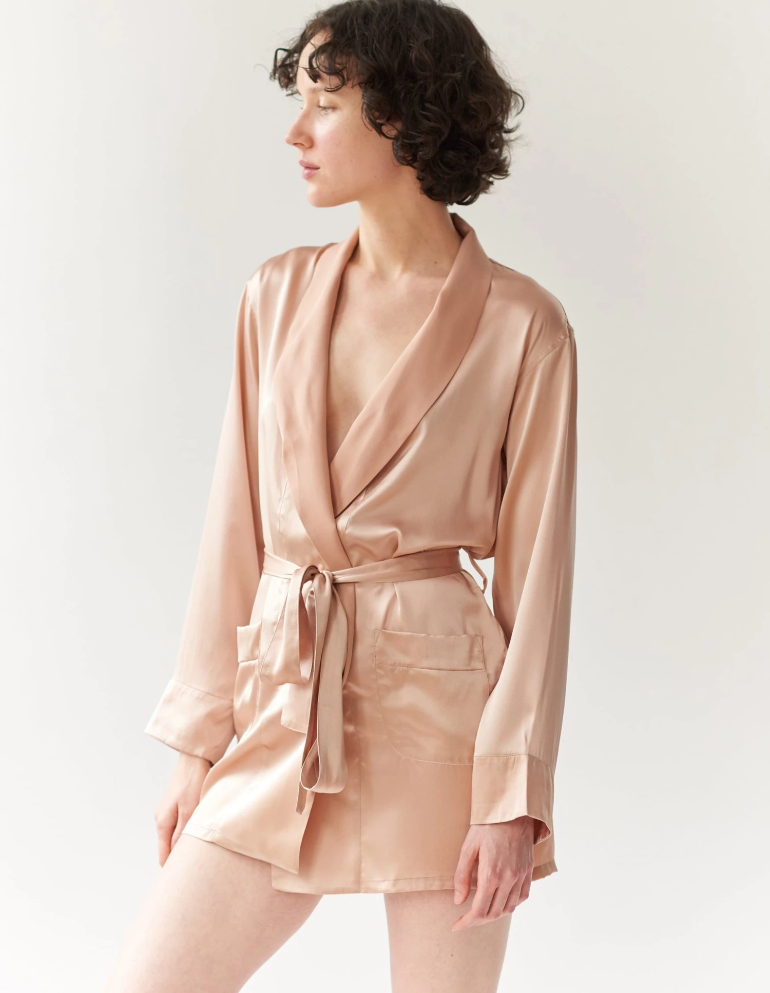 Cut from washed silk charmeuse, the Madeline robe features subtle detailing such as a georgette lapel. Belted with two front pockets, the shortest robe in our collection falls mid-thigh. See other available colorways here.