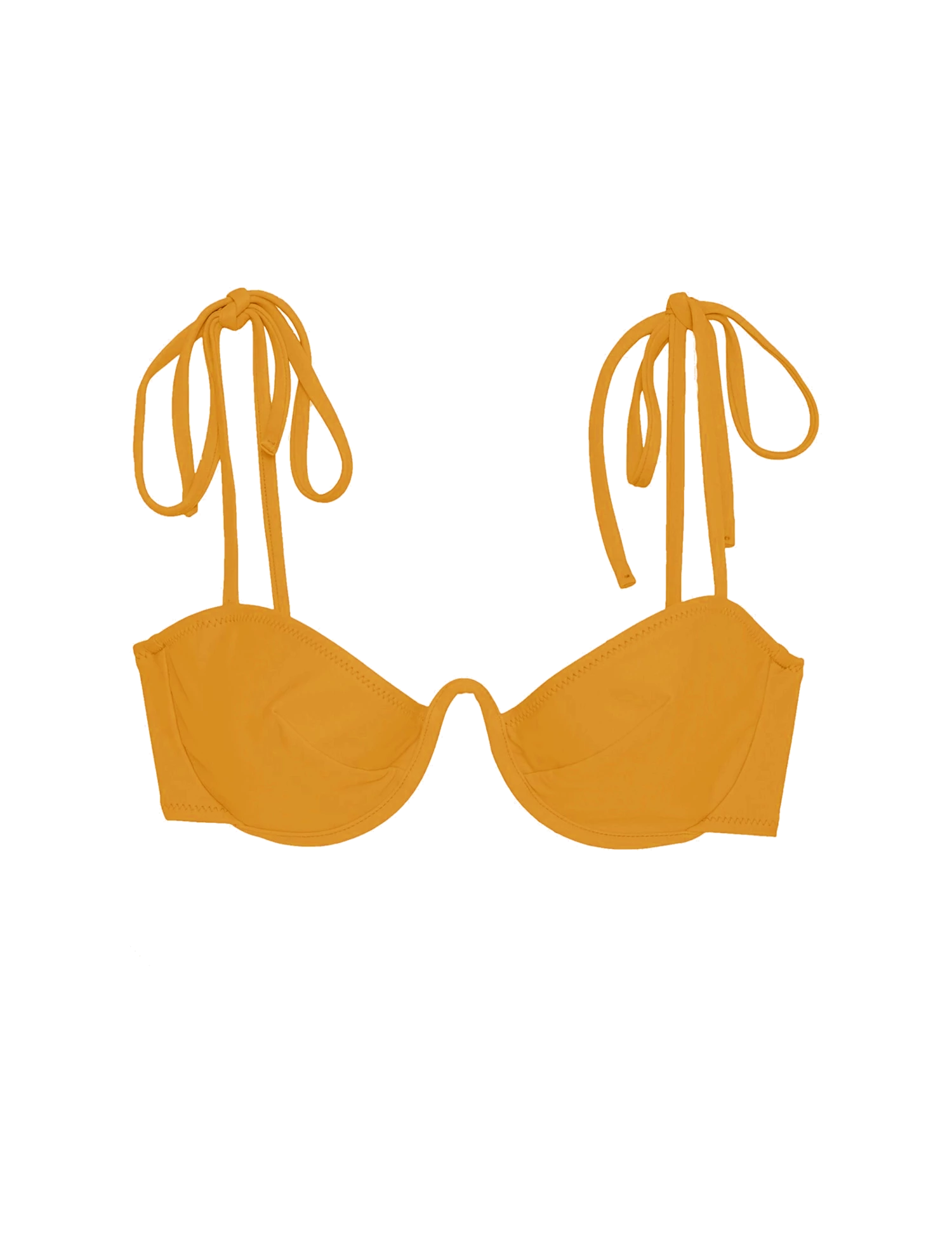A chic underwire bikini top with playful spaghetti straps that tie at the shoulder. Pair it with the Ezra Hipster. See additional colorways.