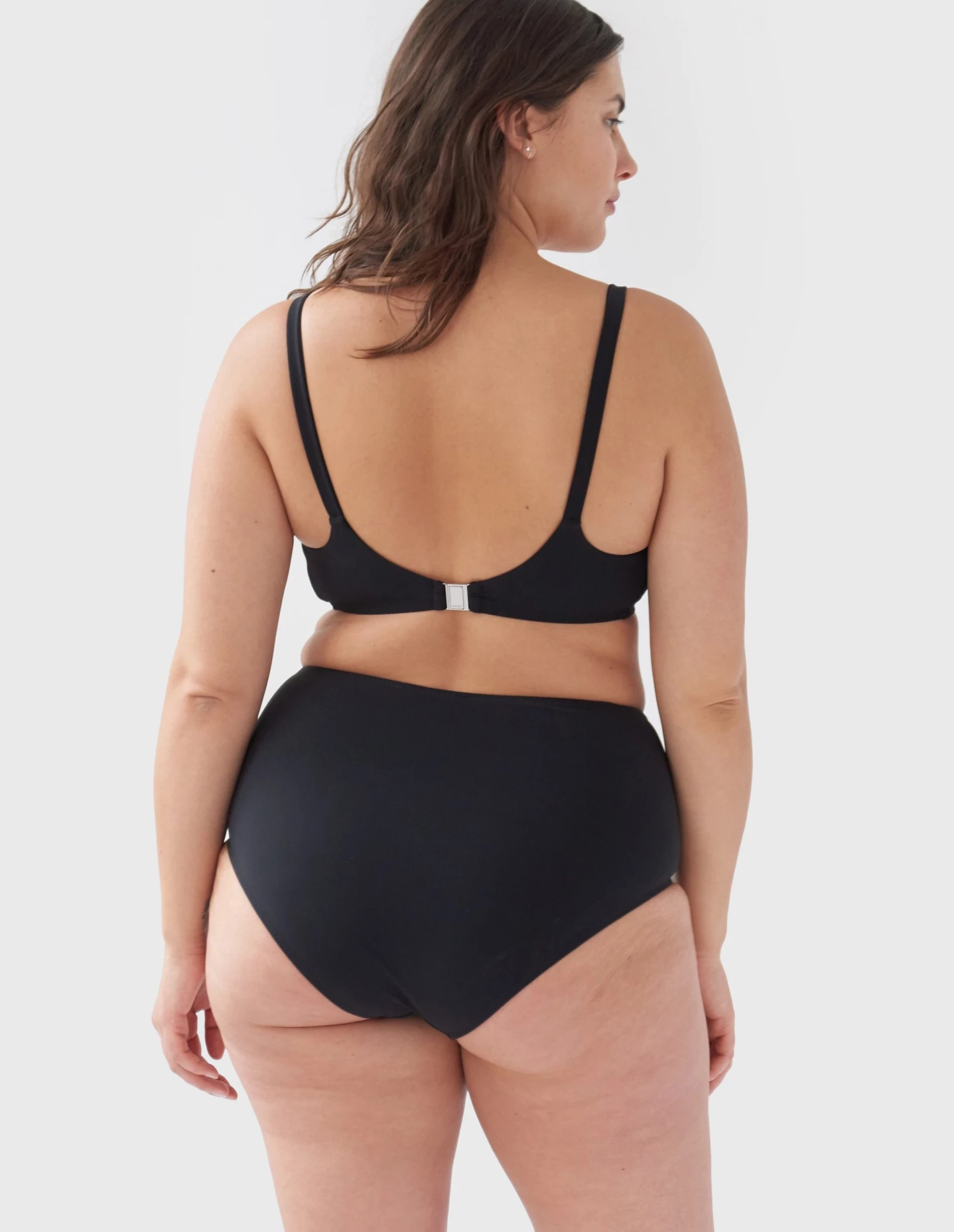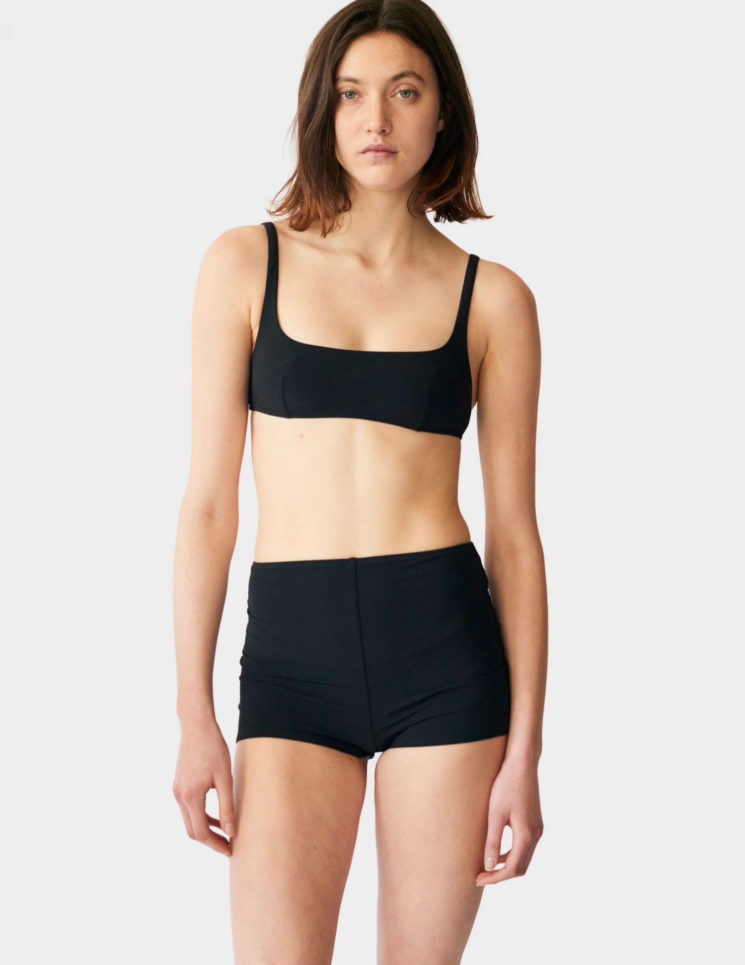 A modern bikini top softened with wide set thin straps and a generously scooped neckline.   Minimal detailing includes a metal closure at back and darts at the bust provide shaping. Wear it with the Ezra Hipster, Ulla Bikini Bottom, Veronica, Camryn, Mallory, Yoko, Yumi or Quenton.  See additional colorways.