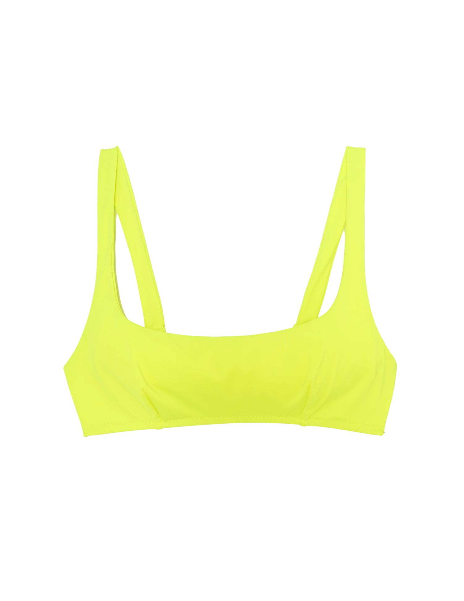 A modern bikini top softened with wide set thin straps and a generously scooped neckline. Minimal detailing includes a metal closure at back and darts at the bust provide shaping. Match the Quinn with the Ulla Bikini Bottom. See additional colorways.