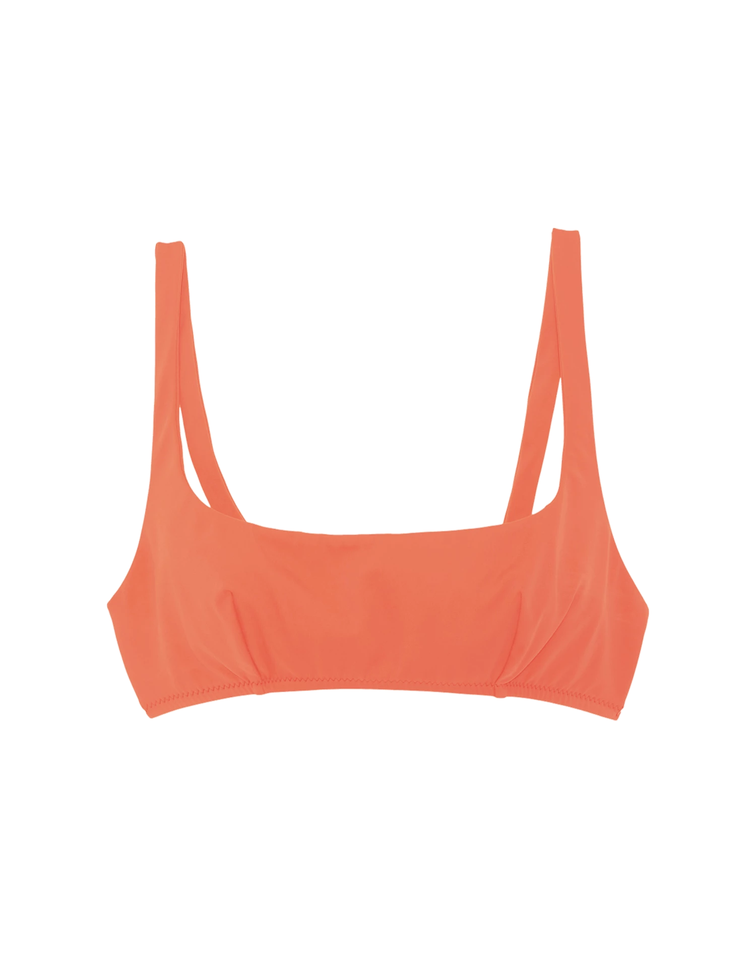 A modern bikini top softened with wide set thin straps and a generously scooped neckline. Minimal detailing includes a metal closure at back and darts at the bust provide shaping. Wear it with the Ulla Bikini Bottom. See additional colorways.