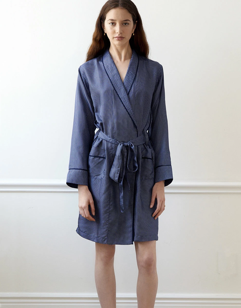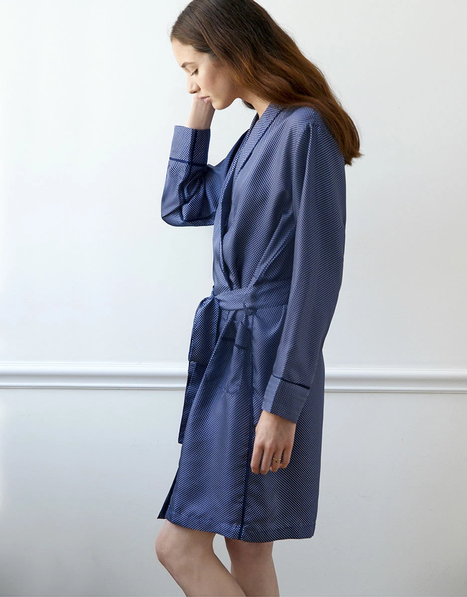 Silk twill robe falling right above the knee with delicate silk chiffon piping and pockets at front.See other available colorways here.