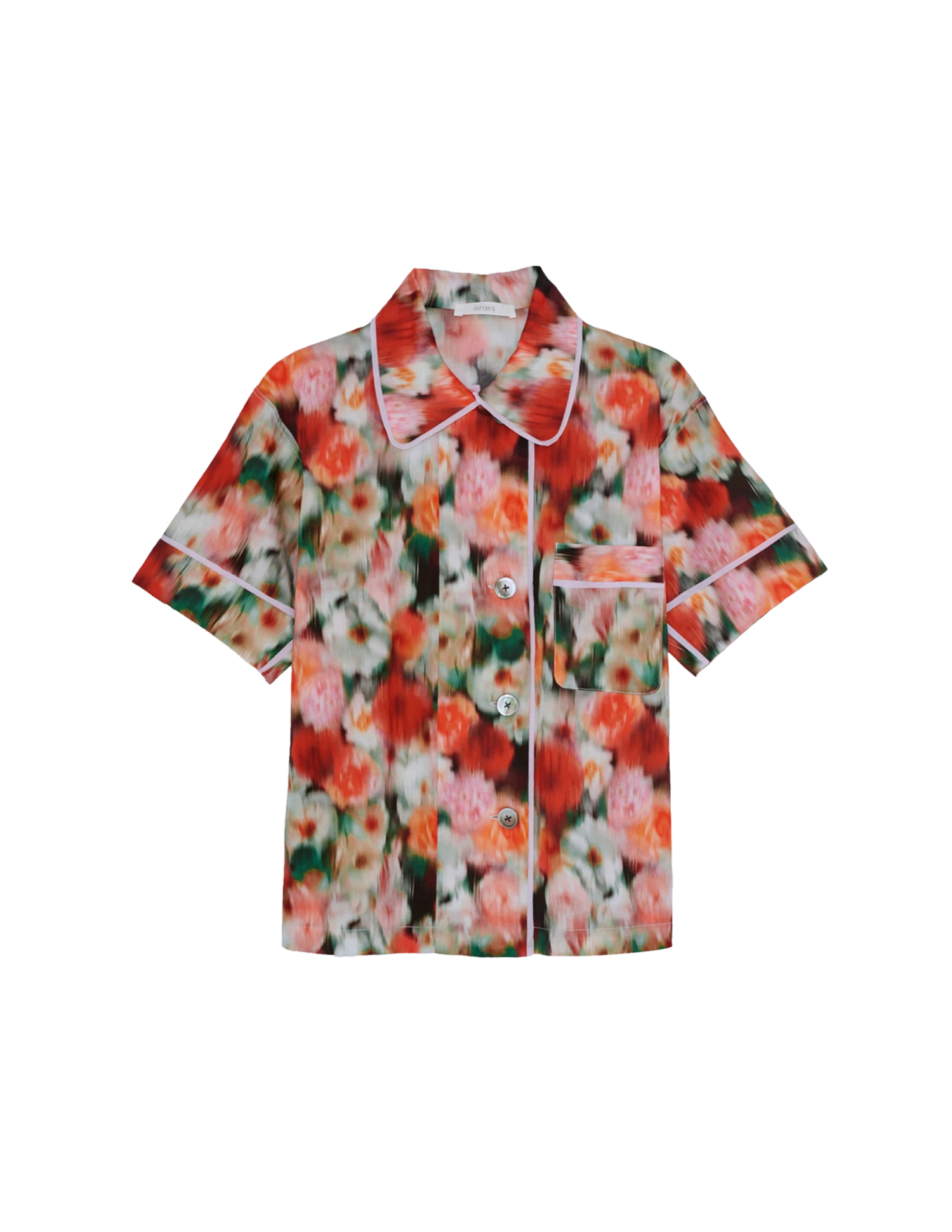 A crisp lightweight cotton pajama top rendered in a fuzzy floral print from Liberty of London. Features include delicate contrasting silk chiffon piping and a chest pocket. Pair it with the matching Tia Boxer or Ally Pajama Pant. See other available colorways.