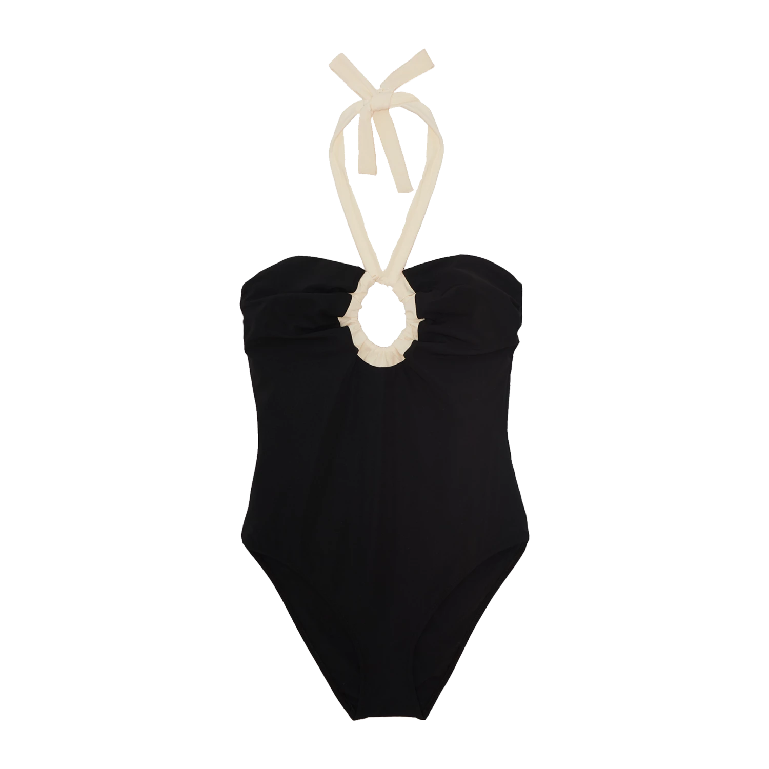 A classic bandeau style one piece featuring a cutout ring detail at front. Use the versatile halter style tie to wear open or closed for different effects.