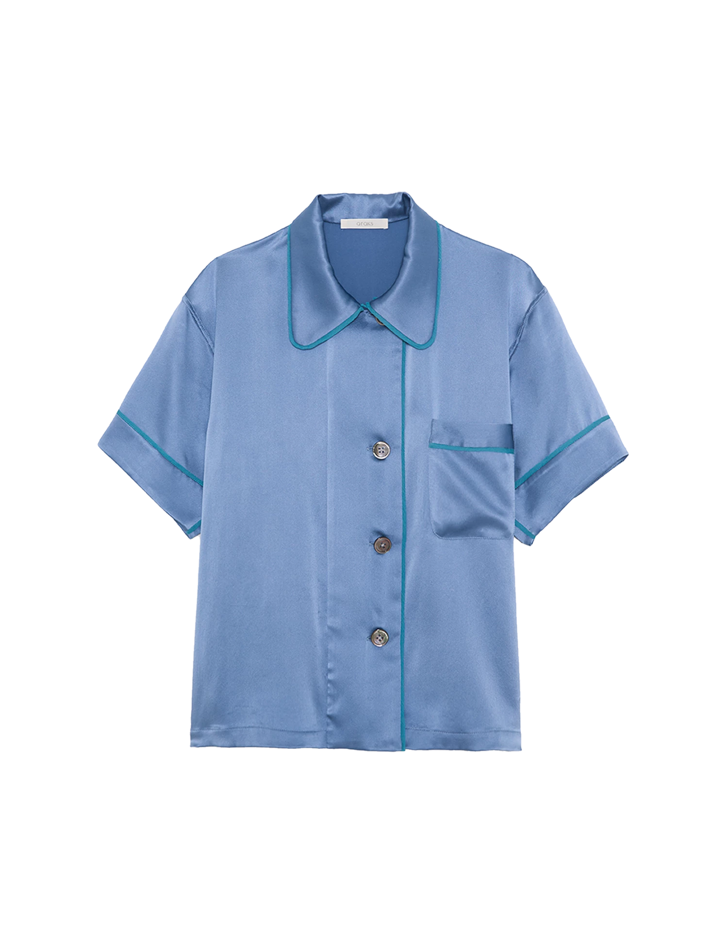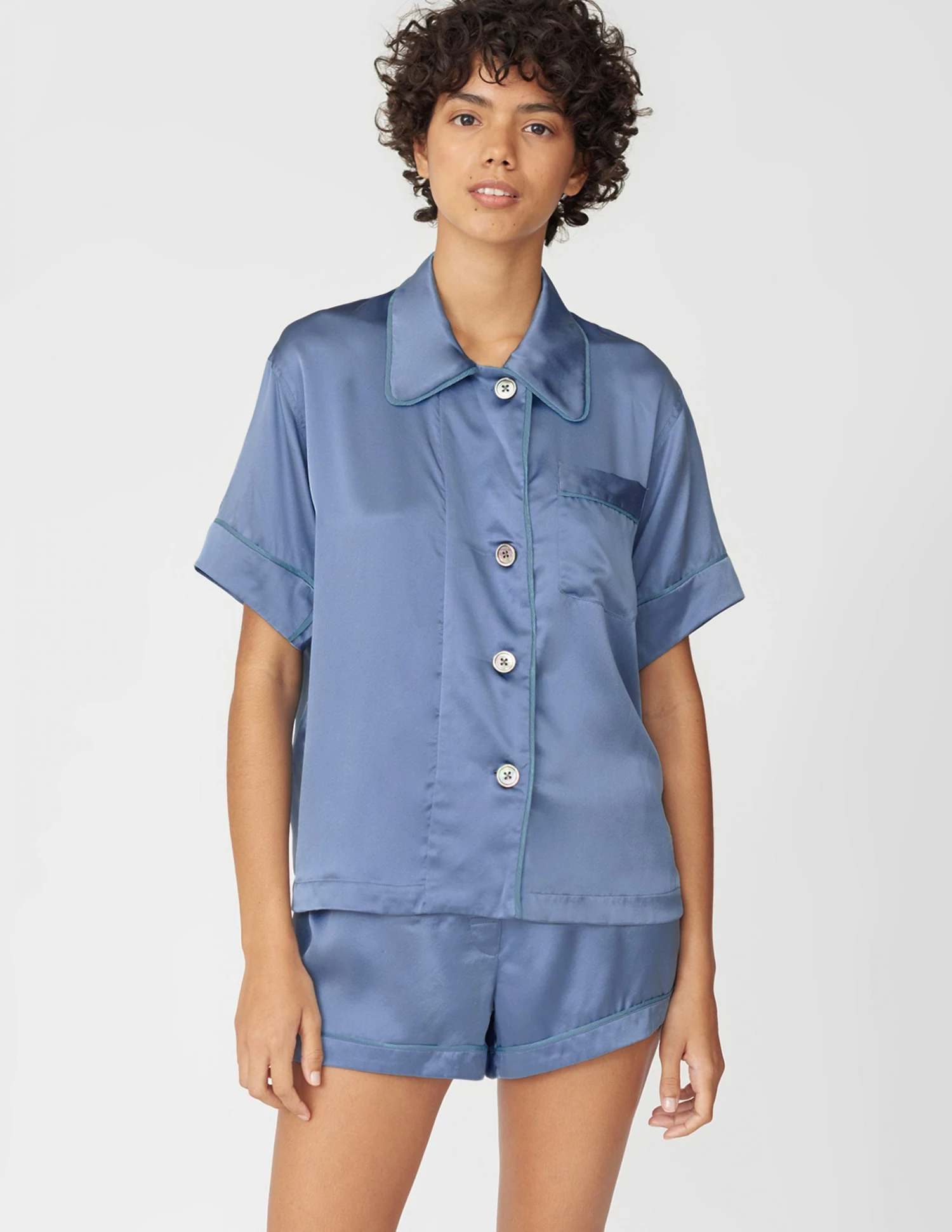 Washed silk charmeuse short sleeve pajama top featuring delicate contrasting silk chiffon piping, mother of pearl buttons, and chest pocket. Pair it with the matching Tia Boxer. See other available colorways here.