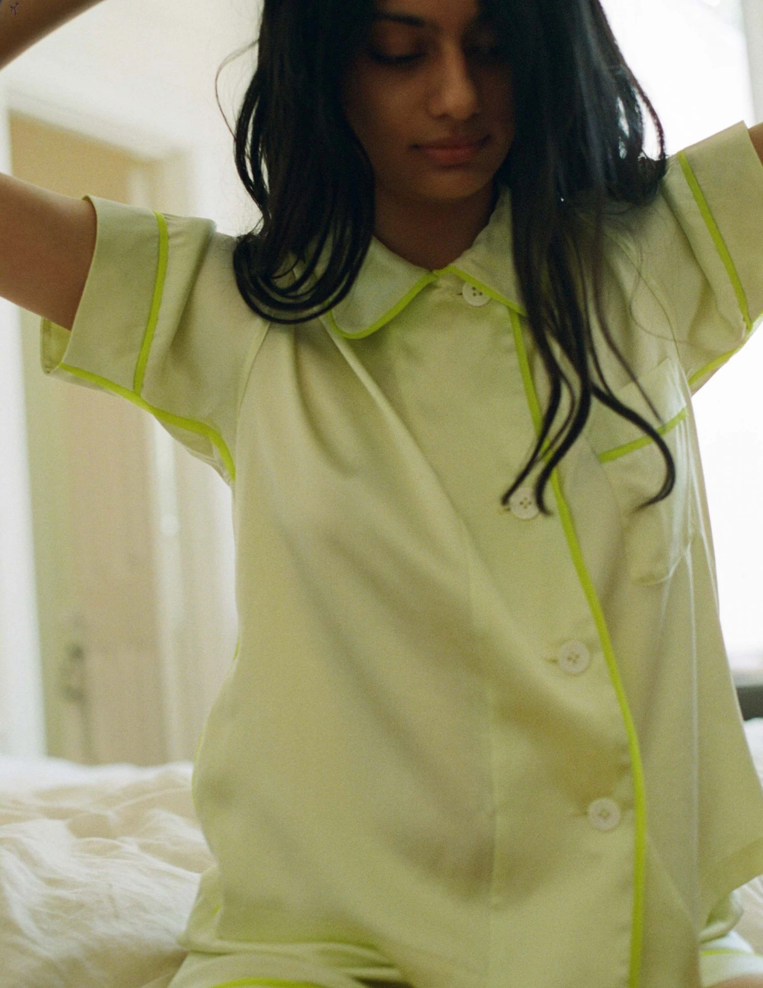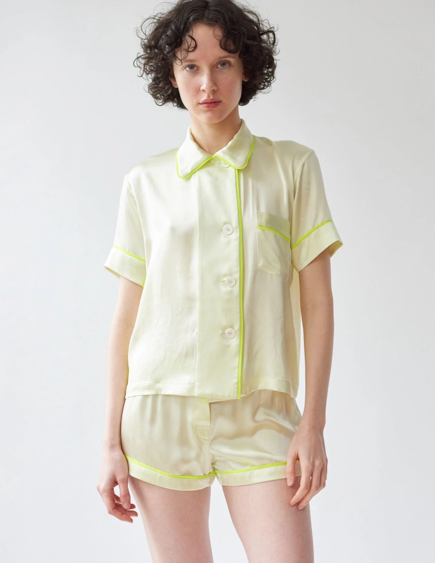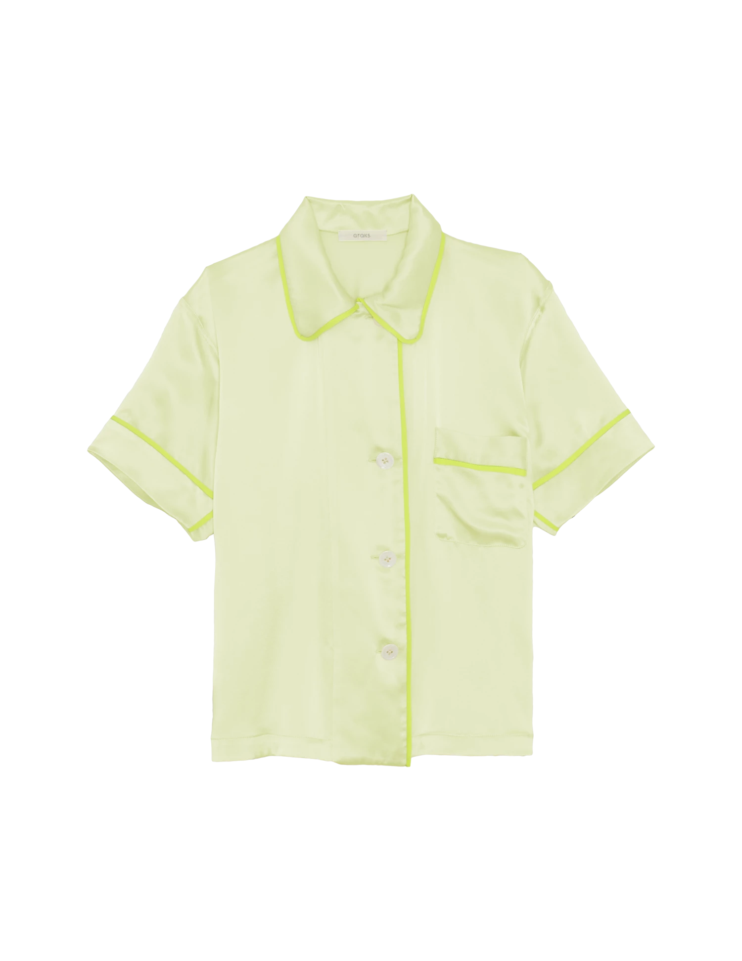 Washed silk charmeuse short sleeve pajama top featuring delicate contrasting silk chiffon piping, mother of pearl buttons, and chest pocket. Pair it with the matching Tia Boxer. See other available colorways here.