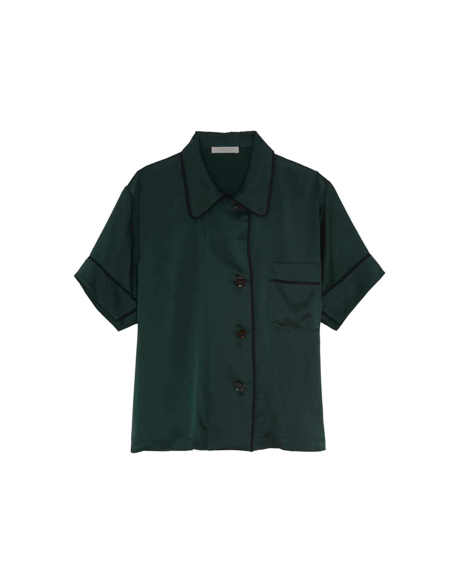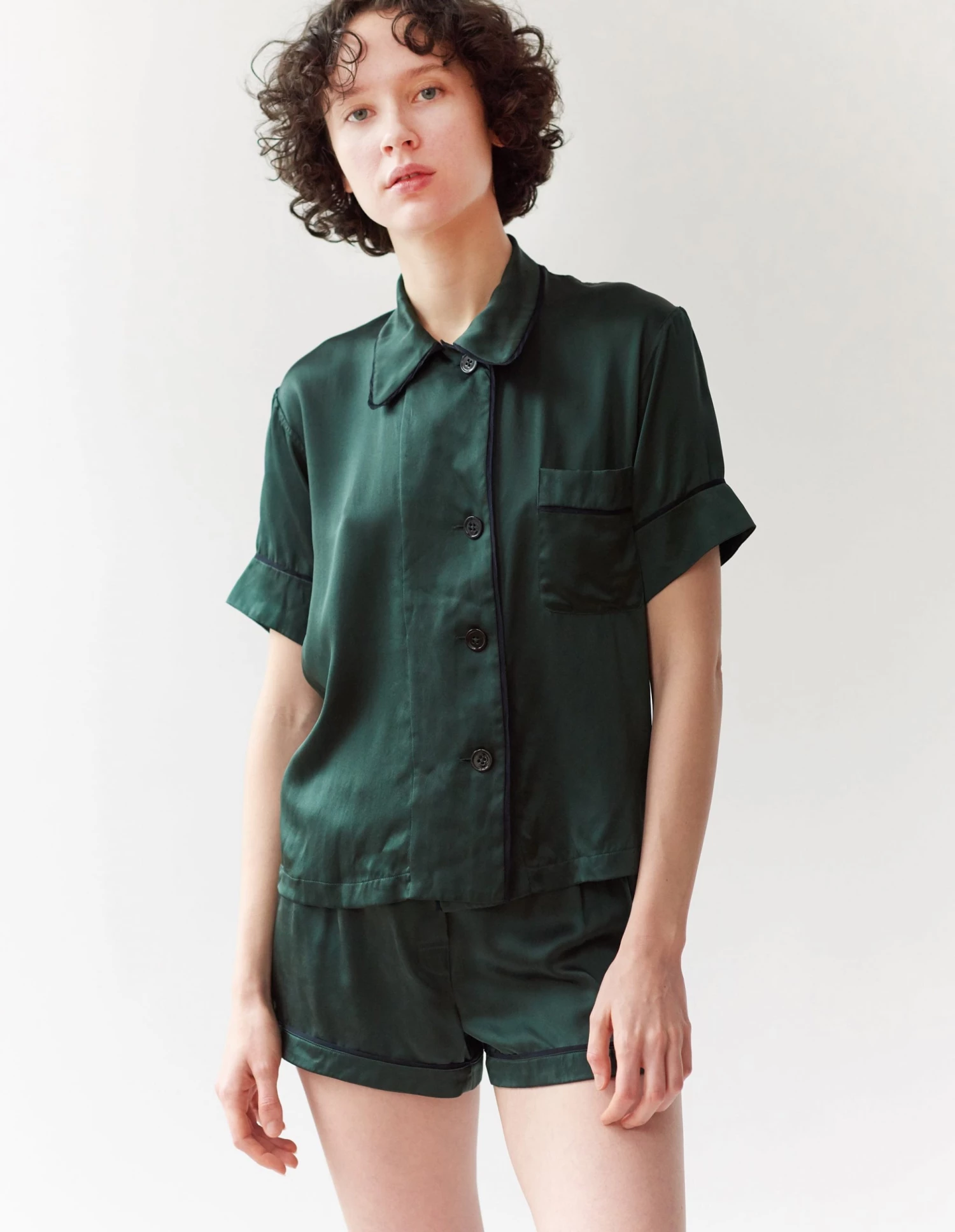 Washed silk charmeuse short sleeve pajama top featuring delicate contrasting silk chiffon piping, mother of pearl buttons, and chest pocket. Pair it with the matching Tia Boxer or Ally Pajama Pant. See other available colorways here.