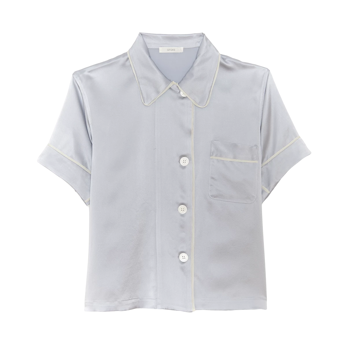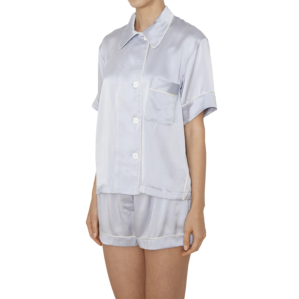 Washed silk charmeuse short sleeve pajama top. Contrasting delicate silk chiffon piping, mother of pearl buttons and chest pocket. Pair it with the matching Tia Boxer. See other available colorways here.