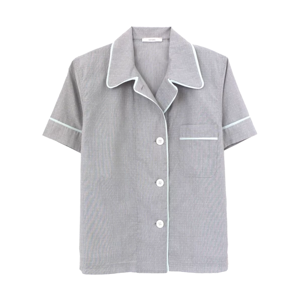Cotton pajama top featuring delicate contrasting silk chiffon piping, mother of pearl buttons, and chest pocket. Pair it with the matching Tia Boxer. See other available colorways here.